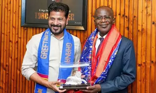 ముఖ్యమంత్రి రేవంత్ రెడ్డిని రిపబ్లిక్ ఆఫ్ ఘన హైకమిషనర్ క్వాసి ఒబిరి-డాన్సో మర్యాదపూర్వకంగా కలిశారు. హైకమిషనర్ గా బాధ్యతలు చేపట్టిన తరువాత తొలిసారిగా క్వాసి ఒబిరి-డాన్ హైదరాబాద్ కు వచ్చారు. ఈ సందర్భంగా ఆయన సిఎం రేవంత్ ను కలిశారు. ఘన, తెలంగాణ మధ్య సంబంధాలు కొనసాగాలని ఆకాంక్షించారు. విద్య, శాస్త్ర సాంకేతిక రంగాలు, ఆరోగ్య, వాణిజ్య రంగాల్లో పరస్పర సహకారం ఉండాలని సిఎం రేవంత్ ను హైకమిషనర్ క్వాసి ఒబిరి డాన్ కోరారు.