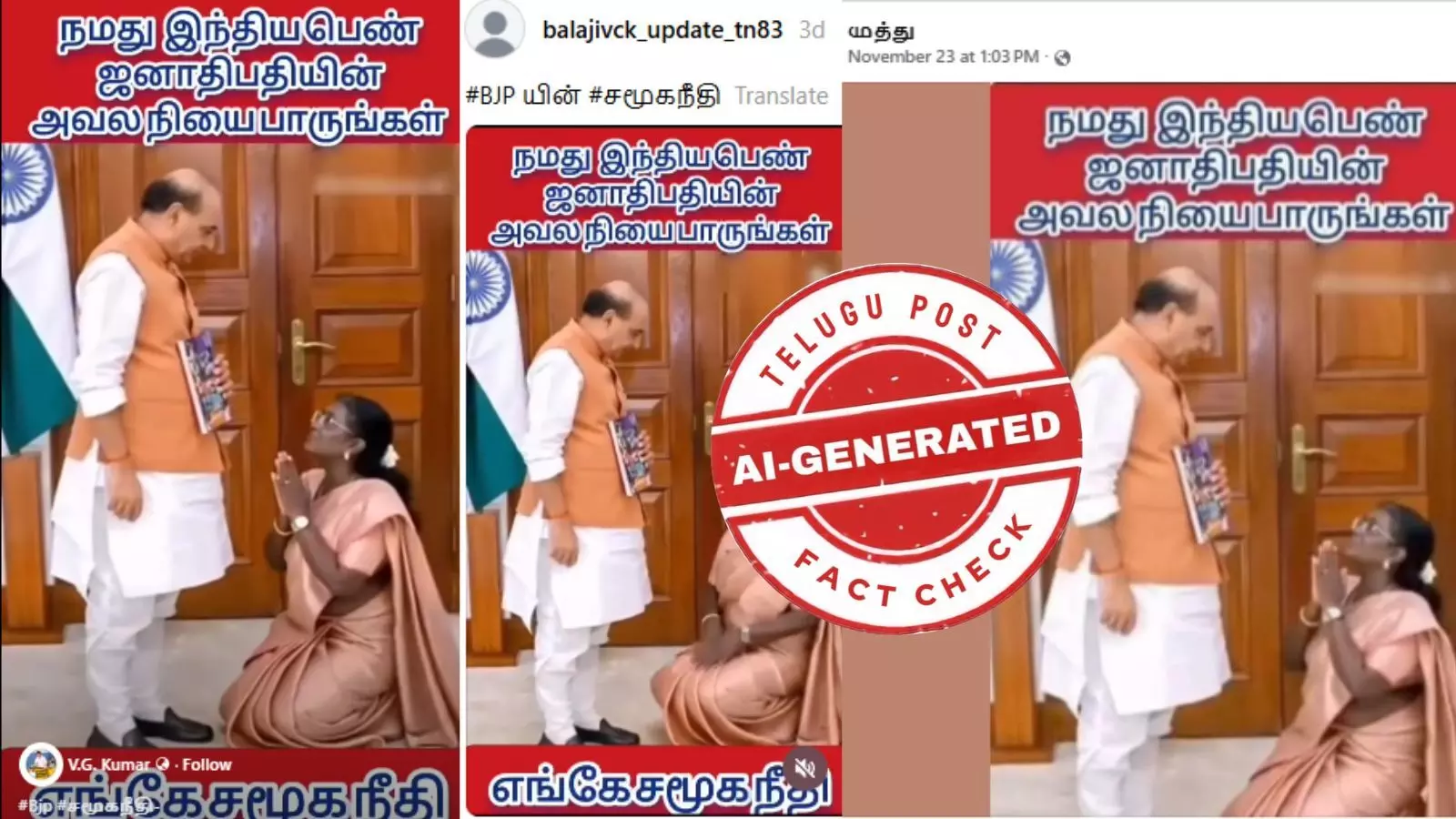 பாதுகாப்புத் துறை அமைச்சர் ராஜ்நாத் சிங் காலில் திரவுபதி முர்மு விழுந்து வணங்கியதாக பரவும் வீடியோ ஏஐ மூலம் போலியாக உருவாக்கப்பட்டது.