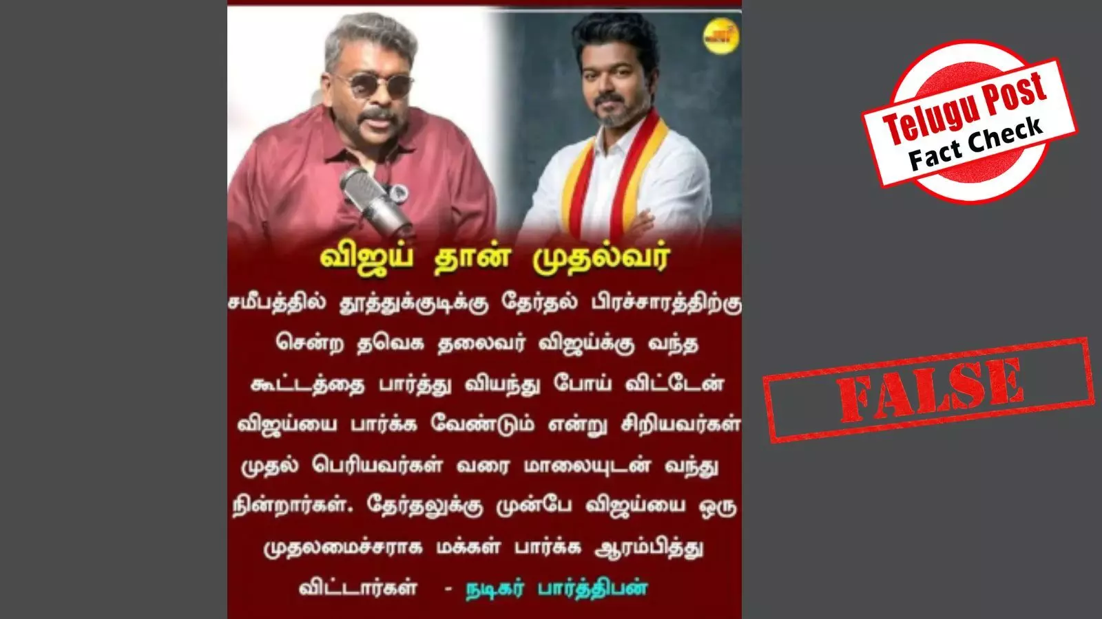 விஜய்யை முதல்வராக மக்கள் பார்க்கத் தொடங்கிவிட்டதாக பார்த்திபன் கூறியதாக பொய்யான தகவலுடன் நியூஸ் கார்டு வைரலாகிறது.