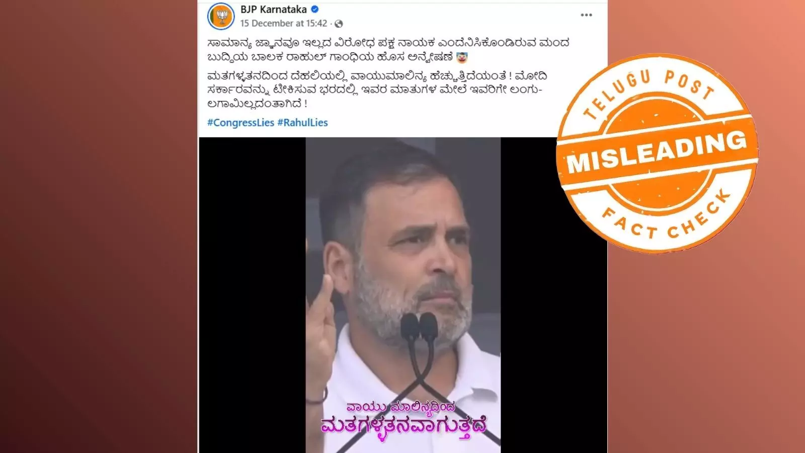 ಮತ ಕಳ್ಳತನವು ದೆಹಲಿ ಮಾಲಿನ್ಯಕ್ಕೆ ಕಾರಣ ಎಂದು ರಾಹುಲ್ ಗಾಂಧಿ ಹೇಳಿದ್ದಾರೆ ಎಂದು ಸುಳ್ಳು ಹೇಳಿಕೆ ಹಂಚಿಕೆ