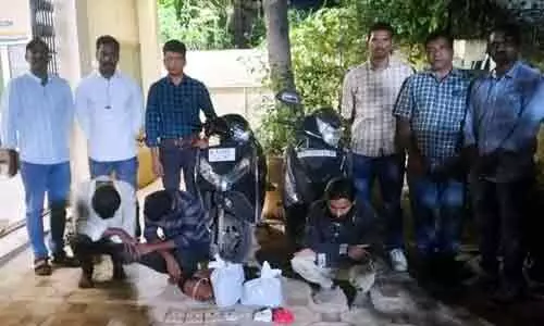 హైదరాబాద్: గంజాయి, డ్రగ్క్ విక్రయిస్తున్న ముగ్గురు వ్యక్తులను ఎక్సైజ్ ఎన్ఫోర్స్మెంట్ సిబ్బంది గురువారం అరెస్టు చేశారు. నిందితుల వద్ద నుంచి 2.50కిలోల గంజాయి, 2గ్రాముల ఎండిఎంఏ, రూ.5,500 నగదు,