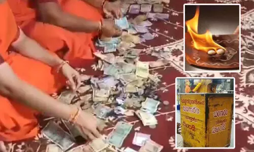 అమరావతి: ఆంధ్రప్రదేశ్ రాష్ట్రం కాకినాడ జిల్లా పిఠాపురంలోని శ్రీపాద శ్రీవల్లభ సంస్థానంలో భక్తురాలు అత్యుత్సాహం ప్రదర్శించింది. కర్పూర హారతి వెలిగించి హుండీలో వేసింది. దీంతో హుండీలో నోట్లకు మంటలు అంటుకున్నాయి. ఆలయ సిబ్బంది హుండీ నుండి పొగలు రావడాన్ని గమనించి నీళ్ళు పోసి మంటల్ని ఆర్పేశారు. కాలిన నోట్లను వేరు చేసి నోట్లను హెయిర్ డ్రైయర్ తో సిబ్బంది ఆరబెట్టారు. భక్తురాలికి భక్తి ఎక్కువగా ఉండడంతో ఆ పని చేసింది నెటిజన్లు కామెంట్లు చేస్తున్నారు.