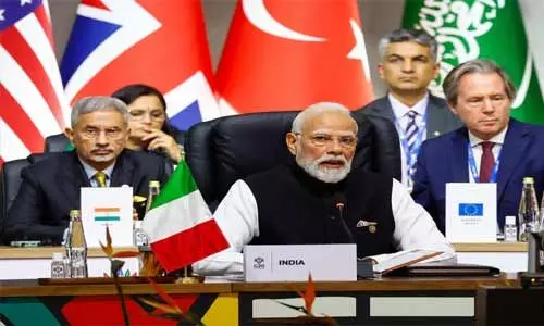 విస్తరిస్తున్న కృత్రిమ మేధ (ఎఐ) దుర్వినియోగం అరికట్టేందుకు ప్రపంచ కట్టుబాట్ల కూటమి ఏర్పాటు అవసరం అని ప్రధాని నరేంద్ర మోడీ పిలుపు నిచ్చారు. జి 20 సమ్మిట్లో ఆయన మూడో సెషన్లో ఆదివారం టి, వినూత్న పరిణామాల విషయంపై విశ్లేషణాత్మక ప్రసంగం చేశారు. అత్యంత కీలకమైన సాంకేతికతు మానవ కేంద్రీకృతం కావాల్సిందే. కేవలం ఆర్థిక లావాదేవీలతోనే సాగరాదని పిలుపు నిచ్చారు. ఈ సందర్భంగా ఆయన ఎఐ ఇతర ఐటి వైపరీత్య లక్షణాల ఆటకట్టుకు అత్యవసరంగా గ్లోబల్ కూటమి అవసరం అని కోరారు. టెక్నాలజీ విధానాలు కేవలం జాతీయం దేశాల పరిమితం కాకుండా అవి గ్లోబల్ కావల్సి ఉంటుందన్నారు. వినూత్న ఆవిష్కరణలు కేవలం పరిమితం , కొందరికే సొంతం కాకుండా అవి బహిరంగ టెక్ వనరుగా మారాల్సి ఉందని కోరారు. ఇప్పటికే తమ దేశం ఈ విస్తృత విధానంతోనే ముందుకు సాగుతోందని వివరించారు. ఇండియన్ టెక్నాలజీ పర్యావరణ వ్యవస్థ దీనిని అనుసంధానం చేసుకుని ఉందని, ఈ క్రమంలో ప్రజలకు బహుళ ప్రయోజనాలు దక్కుతున్నాయని తెలిపారు. అంతరిక్ష రంగం మొదలుకుని ఎఐ వరకూ డిజిటల్ చెల్లింపుల దాకా ఇదే పంథా ఉందన్నారు. డిజిటల్ పేమెంట్స్లో భారత్ గ్లోబల్ స్థాయిలో అగ్రదశలో ఉందని తెలిపారు. ప్రధానమైన ఖనిజాలు, పనివిధానాలు, ఎఐ ఇతర విషయాలలో అందరకి సరైన న్యాయం, భవిత అనే ఇతివృత్తంతో ఈ సెషన్ జరిగింది. ఎఐ రాకను కాదనలేమం అయితే ఇది మానవాళికి ఉపయుక్తం అంతకు మించి మేలు చేసేదిగా ఉండాల్సిందే. , దుర్వినియోగం అరికట్టాల్సిందే. ఇందుకు అంతా ఏకాభిప్రాయంతో కట్టడికి తగు వ్యవస్థను ఏర్పాటు చేసుకోవల్సి ఉందని తెలిపారు. ఎఐను కొన్ని నిర్థిష్ట మౌలిక సూత్రాల పరిధిలోనే వాడుకోవల్సి ఉంటుంది. సమర్థవంతమైన మానవ పర్యవేక్షణ, డిజైన్పరంగా సెఫ్టీ, పారదర్శకత, డీప్ ఫేక్, క్రైమ్, ఉగ్రవాద చర్యలలో దీని వాడకం లేకుండా చూడటం వంటివి అత్యవసరం అని పిలుపు నిచ్చారు. అన్నింటికీ మించి ఎఐతో మానవ సమర్థత , ఫలితం పెరగాల్సిందే. మానవ శక్తి ఇనుమడించాల్సిందే అయితే ఎఐని ఏ విధంగా ఏ స్థాయిలో వాడుకోవల్సిందనే తుది నిర్ణయాధికారం మానవుడిదే అయి ఉండాలి. అది కూడా సమగ్ర గ్లోబల్ కట్టుబాట్ల పరిధిలో ఉండాలని స్పష్టం చేశారు. ఇది ఎఐ కాలం ,ఈ క్రమంలో మన దృక్పథంలో మార్పు అవసరం, ఇప్పటి ఉద్యోగాల అవసరం అనే ఆలోచన క్రమేపీ రేపటి సమర్థవంతమైన అవకాశాల దిశకు మారాల్సి ఉంటుందని. ఉద్యోగ నిర్వహణ నుంచి ఉద్యోగ ఉపాధి సృష్టి దశకు దారితీయాల్సిందే అన్నారు.
