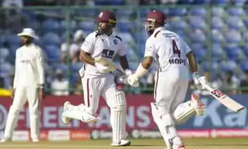 న్యూఢిల్లీ: రెండు టెస్ట్ల సిరీస్లో భాగంగా అరుణ్ జైట్లీ స్టేడియం వేదికగా భారత్-వెస్టిండీస్ మధ్య జరుగుతున్న రెండో టెస్ట్ మ్యాచ్ మూడో రోజు ఆట ముగిసింది. ఈ మ్యాచ్లో తొలుత భారత్ 518/5 వద్ద ఇన్నింగ్స్ డిక్లేర్డ్ చేసిన విషయం తెలిసిందే. అయితే తొలి ఇన్నింగ్స్లో భారత స్పిన్నర్లు కుల్దీప్ (5 వికెట్లు), జడేజా (3 వికెట్లు) చెలరేగిపోవడంతో వెస్టిండీస్ 248 పరుగులకే ఆలౌట్ అయింది. దీంతో వెస్టిండీస్ 270 పరుగులు వెనుకంజలో ఉండి ఫాలోఆన్ నుంచి తప్పించుకోలేకపోయింది. అయితే రెండో ఇన్నింగ్స్లోనూ వెస్టిండీస్ 35 పరుగులకే రెండు వికెట్లు కోల్పోయింది. ఓపెనర్ చంద్రపాల్ (20) సిరాజ్ బౌలింగ్లో, అలిక్ అతాంజే (7) సుందర్ బౌలింగ్లో పెవిలియన్ చేరారు. దీంతో మూడో రోజే విండీస్ ఆలౌట్ అవుతుందని అంతా భావించారు. కానీ, ఓపెనర్ జాన్ క్యాంప్బెల్, షాయ్ హోలు కలిసి వీరోచితంగా పోరాడారు. వికెట్ కాపాడుకుంటూ స్కోర్ని పెంచుతూ బ్యాటింగ్ చేశారు. ఈ క్రమంలో ఇరువురు అర్థ శతకాలు సాధించారు. దీంతో మూడో రోజు ఆట ముగిసే సమయానికి వెస్టిండీస్ 49 ఓవర్లలో 2 వికెట్లు నష్టపోయి 173 పరుగులు చేసింది. దీంతో వెస్టిండీస్ ఇంకా 97 పరుగుల వెనుకంజలో ఉంది. క్రీజ్లో క్యాంప్బెల్ (87), హోప్ (66) ఉన్నారు.