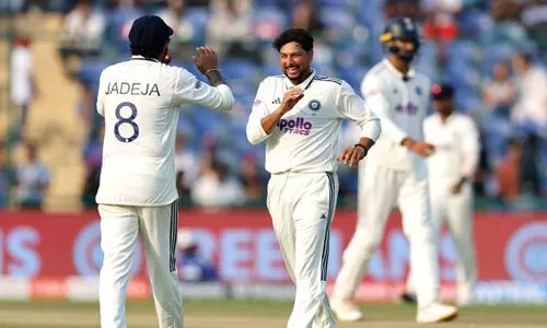 న్యూఢిల్లీ: భారత్తో ఢిల్లీ వేదికగా జరుగుతున్న రెండో, చివరి టెస్టులో వెస్టిండీస్ ఎదురీదుతోంది. తొలి ఇన్నింగ్స్లో విండీస్ 248 పరుగులకే కుప్పకూలింది. దీంతో 270 పరుగులు వెనుకబడి ఫాలో ఆన్ ఆడక తప్పలేదు. అయితే రెండో ఇన్నింగ్స్లో విండీస్ మెరుగైన బ్యాటింగ్ను కనబరుస్తోంది. ఒక దశలో 35 పరుగులకే రెండు వికెట్లు కోల్పోయి కష్టాల్లో చిక్కుకున్న విండీస్ను జాన్ కాంప్బెల్, షాయ్ హోప్లు ఆదుకున్నారు. ఇద్దరు భారత బౌలర్లను దీటుగా ఎదుర్కొంటూ విండీస్ ఇన్నింగ్స్ను పటిష్ట పరిచారు. ఆదివారం మూడో రోజు ఆట ముగిసే సమయానికి విండీస్ 49 ఓవర్లలో 2 వికెట్ల నష్టానికి 173 పరుగులు చేసింది. అద్భుత ఇన్నింగ్స్ ఆడిన హోప్ 103 బంతుల్లో 8 ఫోర్లు, రెండు సిక్సర్లతో 66 పరుగులు చేసి క్రీజులో ఉన్నాడు. జాన్ కాంప్బెల్ 145 బంతుల్లో 9 బౌండరీలు, రెండు సిక్స్లతో 87 పరుగులు చేసి నాటౌట్గా నిలిచాడు. ఇద్దరు ఇప్పటికే మూడో వికెట్కు అజేయంగా 138 పరుగులు జోడించారు. కాగా, ఈ మ్యాచ్లో ఇన్నింగ్స్ ఓటమిని తప్పించుకోవాలంటే విండీస్ మరో 97 పరుగులు చేయాలి. కుల్దీప్ మ్యాజిక్.. అంతకుముందు ఓవర్నైట్ స్కోరు 140/4తో తొలి ఇన్నింగ్స్ తిరిగి చేపట్టిన విండీస్కు ఆరంభంలోనే కష్టాలు మొదలయ్యాయి. భారత బౌలర్ కుల్దీప్ యాదవ్ అసాధారణ బౌలింగ్తో చెలరేగి పోయాడు. షాయ్ హోప్ ఐదు ఫోర్లతో 36 పరుగులు చేసి కుల్దీప్ వేసిన అద్భుత బంతికి క్లీన్ బౌల్డ్ అయ్యాడు. కొద్ది సేపటికే వికెట్ కీపర్ టెవిన్ ఇమ్లాచ్ (21) కూడా ఔటయ్యాడు. అతన్ని కూడా కుల్దీప్ ఔట్ చేశాడు. అంతేగాక జస్టిన్ గ్రీవ్స్ (17)ను కూడా కుల్దీప్ వెనక్కి పంపాడు. ఖారి పిరె (23)ను బుమ్రా బౌల్డ్ చేయగా, వారికన్ (1)ను సిరాజ్ క్లీన్ బౌల్డ్ చేశాడు. ఇక కీలక ఇన్నింగ్స్ ఆడిన అండర్సన్ ఫిలిప్ 93 బంతుల్లో 24 పరుగులు చేసి నాటౌట్గా నిలిచాడు. జైడెన్ సీల్స్ (13)ను కుల్దీప్ ఔట్ చేయడంతో విండీస్ తొలి ఇన్నింగ్స్ 81.5 ఓవర్లలో 248 పరుగుల వద్ద ముగిసింది. భారత బౌలర్లలో కుల్దీప్ ఐదు, జడేజా మూడు, సిరాజ్, బుమ్రా ఒక్కొ వికెట్ను పడగొట్టారు. కాగా, భారత్ తొలి ఇన్నింగ్స్లో ఐదు వికెట్ల నష్టానికి 518 పరుగులు చేసి డిక్లేర్డ్ చేసిన సంగతి తెలిసిందే.